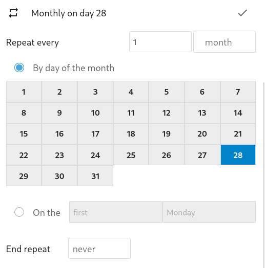 An event may be set as “recurring”, so that it can happen every day, week, month or year. Specific rules can be added to set which day of the week the event happens or more complex rules, such as every fourth Wednesday of each month.