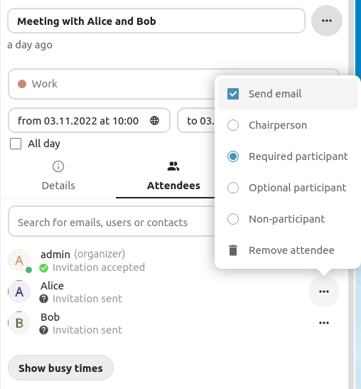 You may add attendees to an event to let them know they’re invited. They will receive an email invitation and will be able to confirm or cancel their participation to the event. Attendees may be other users on your Nextcloud instances, contacts in your address books and direct email addresses. You may also change the level of participation per attendees, or disable the email information for a specific attendee.