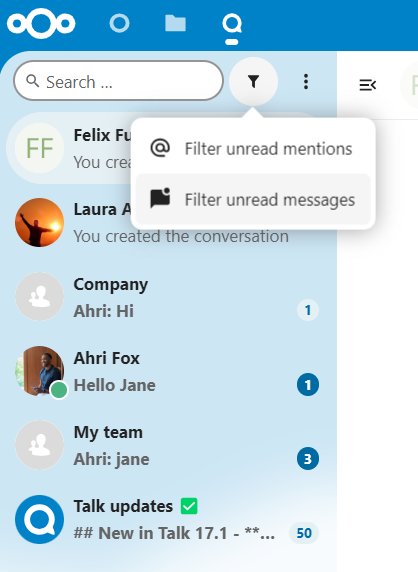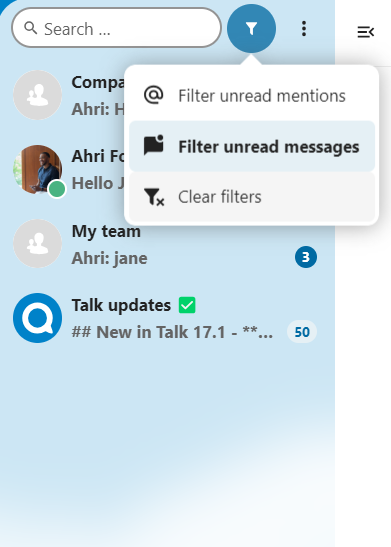 You can filter your conversations using the filter button located next to the search field. There are two options for filtering: 1. Filter unread mentions: This option allows you to view group conversations with unread mentions or unread one-on-one conversations. 2. Filter unread messages: This option allows you to view all unread messages in all joined conversations.