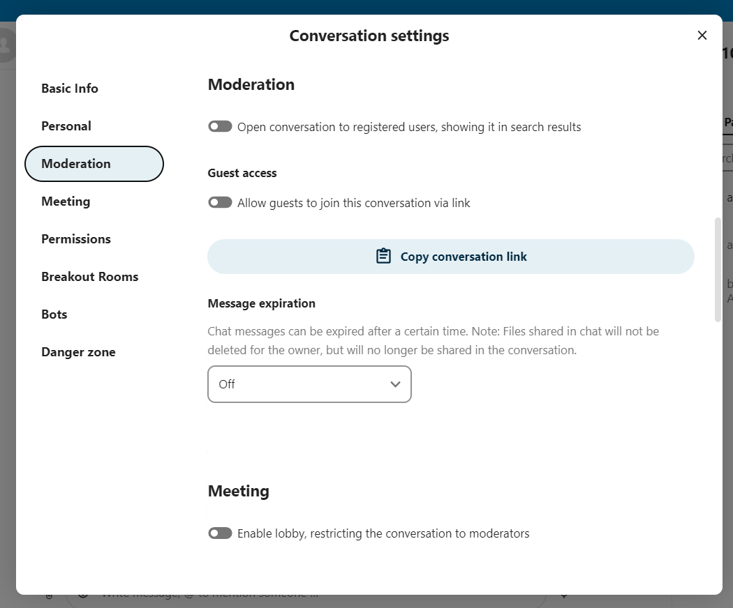 A moderator can configure message expiration under the Conversation settings within the Moderation section. Once a message reaches its expiration time, it is automatically removed from the conversation. The available expiration durations are 1 hour, 8 hours, 1 day, 1 week, 4 weeks, or never (which is the default setting).