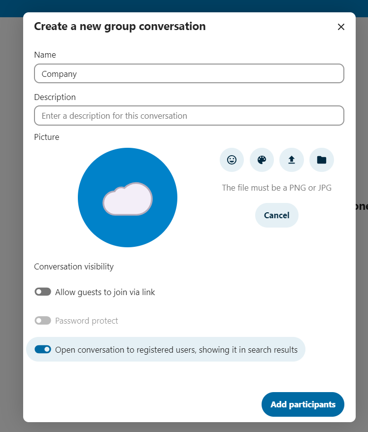 You can then pick a name for the conversation, put a description, and set up an avatar for it (with uploaded photo or emoji), and select if the conversation should be open to external users and if other users on the server can see and join the conversation.