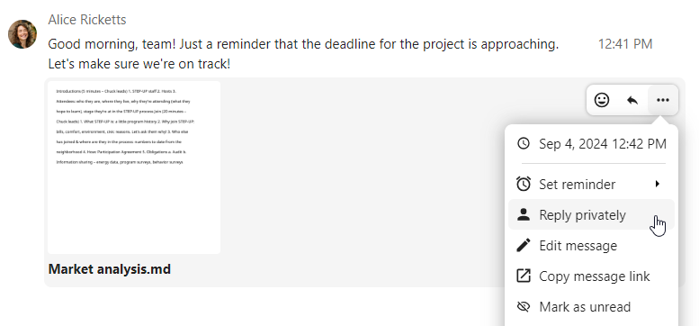 In the ... menu you can also choose to reply privately. This will open a one-on-one chat.