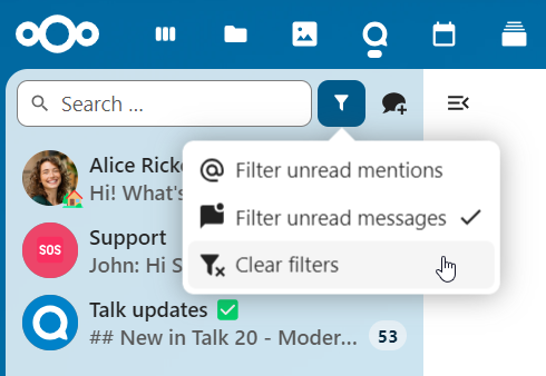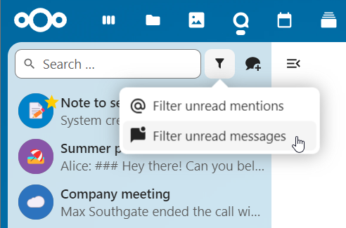 You can filter your conversations using the filter button located next to the search field. There are two options for filtering: 1. Filter unread mentions: This option allows you to view group conversations with unread mentions or unread one-on-one conversations. 2. Filter unread messages: This option allows you to view all unread messages in all joined conversations.