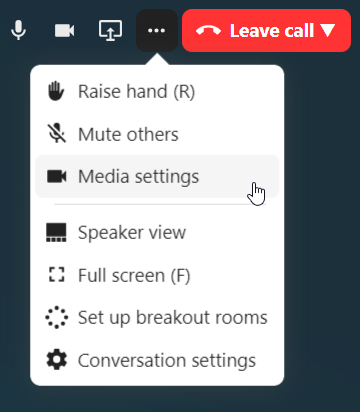 You can access your settings and choose a different webcam, microphone and other settings in the ... menu in the top bar.
