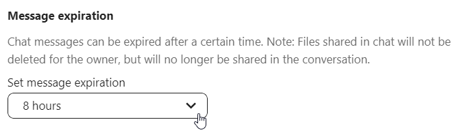 A moderator can configure message expiration under the Conversation settings within the Moderation section. Once a message reaches its expiration time, it is automatically removed from the conversation. The available expiration durations are 1 hour, 8 hours, 1 day, 1 week, 4 weeks, or never (which is the default setting).