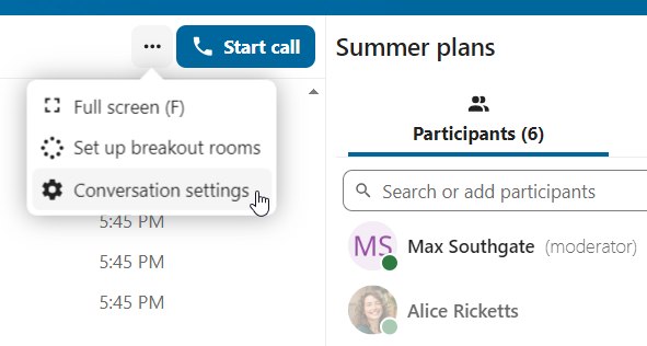 Moderators can configure the conversation. Select Conversation settings from the ... menu of the conversation on the top to access the settings.