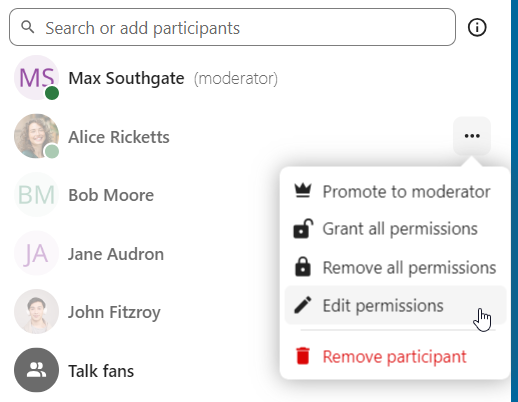 You are always moderator in your new conversation. In the participant list you can promote other participants to moderators using the ... menu to the right of their user name, assign them custom permissions or remove them from the conversation.