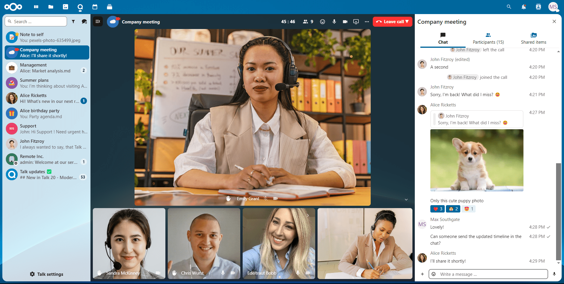 Nextcloud Talk lets you chat and have video calls on your own server.